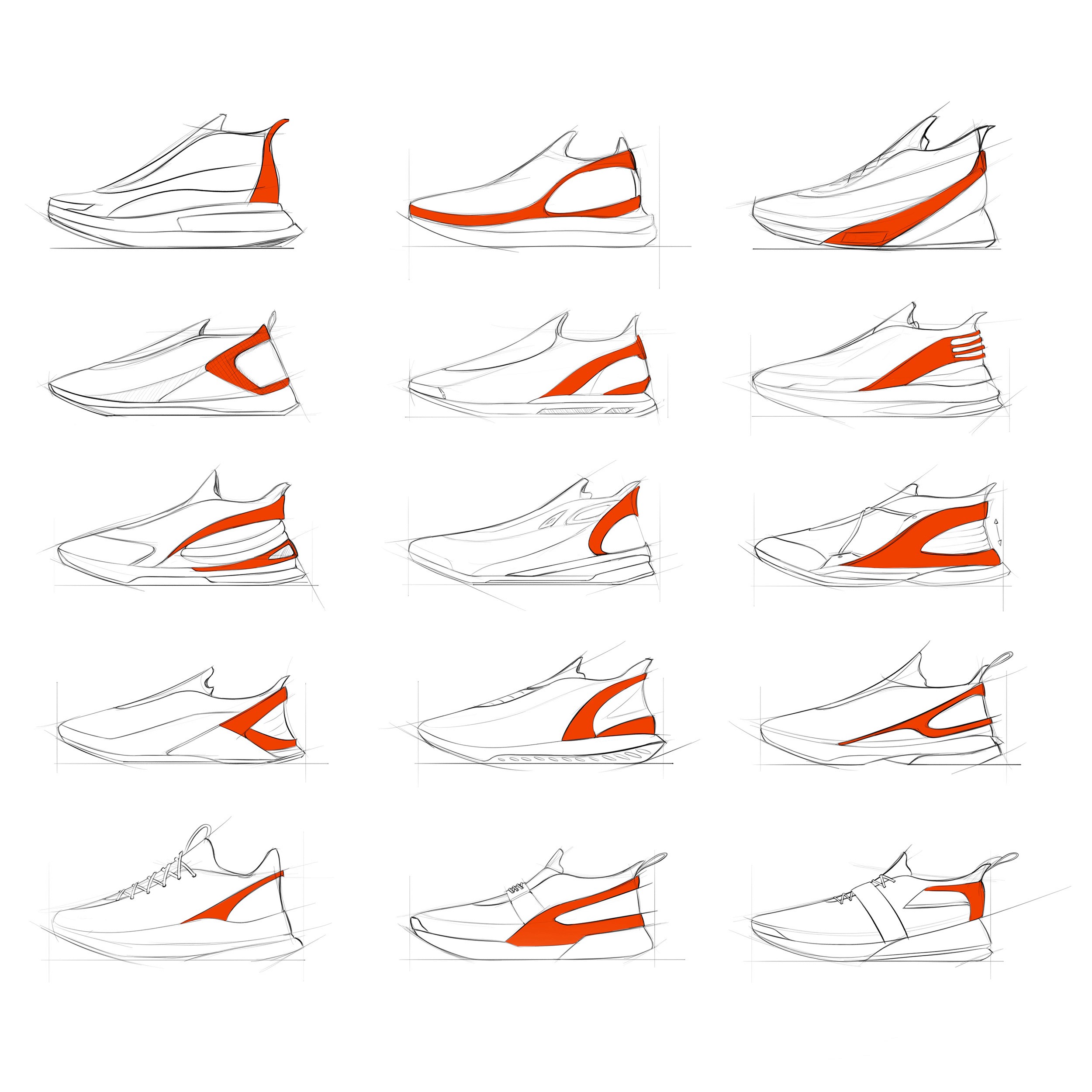The sketches explore proportion, interior layout, surface language, and early concept direction across a range of product categories.